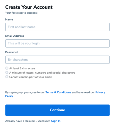 3. Si aún no tienes una cuenta activa en Helium 10, ingresa la información requerida, de lo contrario haz clic en "Sign In" para iniciar sesión.