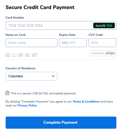 6. Ingresa los datos de la tarjeta y el lugar de facturación (no es imprescindible que el nombre de la tarjeta coincida con el de la cuenta). Después pulsa “Complete Payment”.